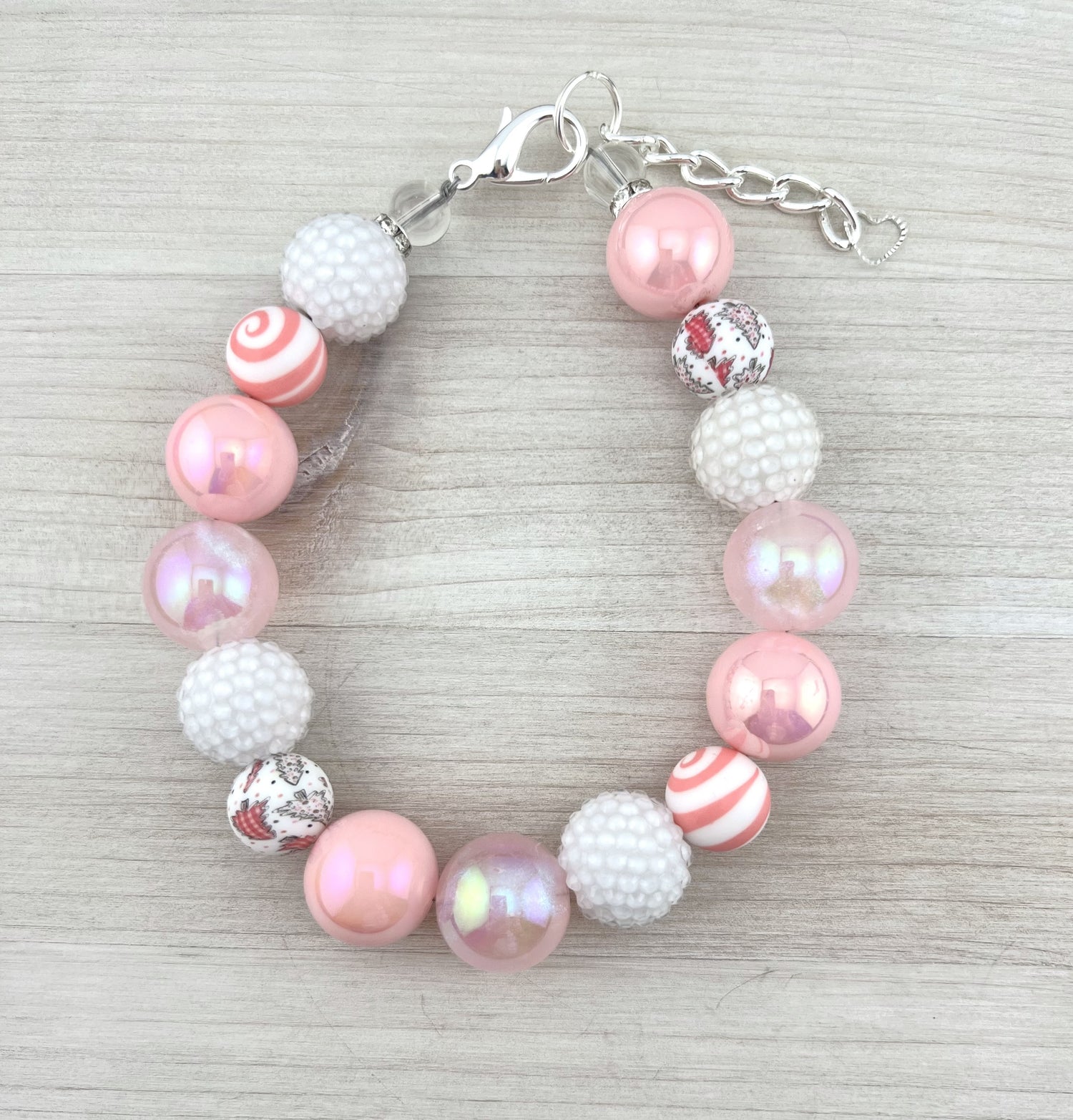 *20mm Acrylic Beads with 15mm Silicone bead accents *Tiger Wire with silver-toned clasp and two-inch extender chain - or - *Stretch cord elastic