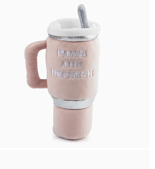 Quench your pup's playtime with our Snuggly Cup, the iconic tumbler! The back proudly reads "Paws and Refresh," offering a delightful twist to the classic cup experience. Pup's playtime will be filled with excitement when they dig into the Paws and Refresh toy tumbler. This plush, squeaky toy ensures your dogs playtime fun.