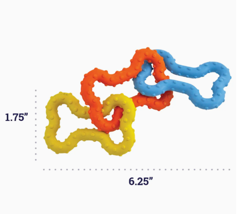 The Petstages Mini Bone Tug Puppy chew toy is a floppy and fun take on a traditional chew toy. This multicolored chew toy is made of three interlocking rubber bones that feature a ridge texture that massages your puppy's gums as they chew. The pliable rubber material makes this chew toy great for games of tug-of-war as well toss and fetch. Cleans easily with warm soap and water.